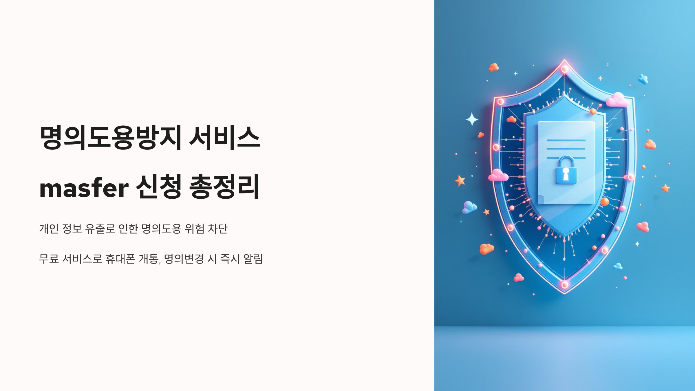 **Masfer(엠세이퍼)**는 이동통신사업자가 제공하는 무료 명의도용방지 서비스입니다. 당신의 명의로 휴대폰이 신규 개통되거나 명의가 변경될 때, 해당 사실을 SMS 또는 이메일로 즉시 알려주어 명의도용으로 인한 피해를 예방할 수 있도록 돕습니다.