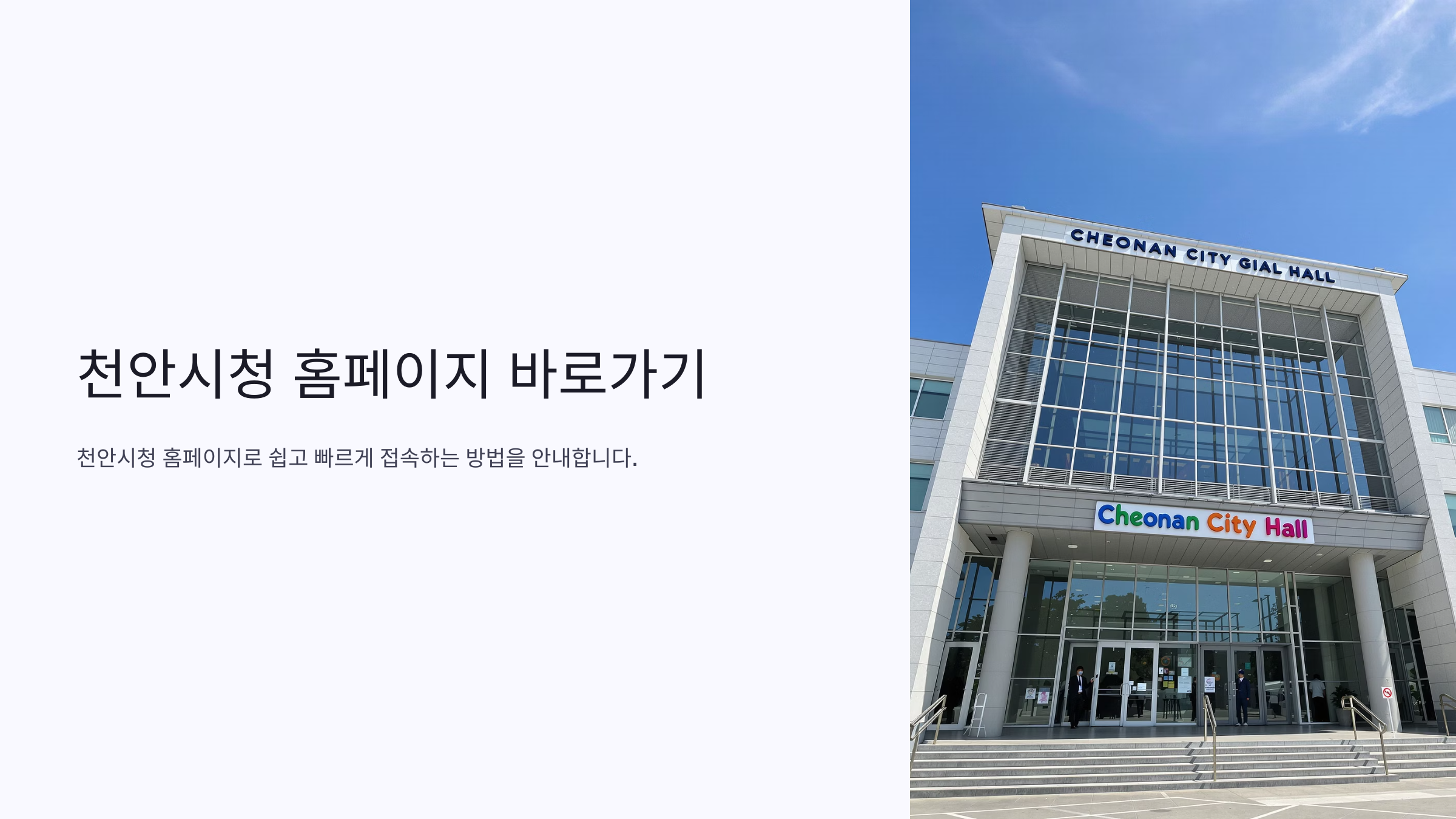 위 링크를 클릭하시면 즉시 천안시청 홈페이지로 이동합니다. 이제부터 천안시의 다양한 정보를 편리하게 확인하세요!