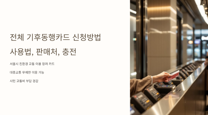 지속 가능한 친환경 교통 이용을 장려하고 시민들의 교통비 부담을 덜어주기 위해 서울시에서 야심차게 도입한 기후동행카드! 단 한 장의 카드로 서울 시내의 다양한 대중교통 수단을 무제한으로 이용할 수 있다는 매력 덕분에 많은 시민들의 관심을 받고 있습니다. 복잡하게 느껴질 수 있는 기후동행카드의 신청 방법부터 편리한 사용법, 구매처, 그리고 충전까지, 이 모든 정보를 쉽고 상세하게 안내해 드리겠습니다. 기후동행카드로 더욱 스마트하고 경제적인 서울 생활을 시작해 보세요!